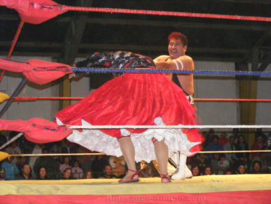 Ces lutteuses en jupons sautent de la troisième corde, volent dans