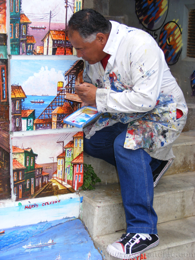 Mario a 50 ans et vit à Valparaiso depuis toujours. Sa carrière de peintre a débuté à l'âge de 17 ans. Plus jeune, ses parents s'obstinaient à vouloir faire de lui un marin et lui cachaient ses pinceaux pour ne pas qu'il s'adonne secrêtement à sa passion. Mais le petit Mario persévéra et aujourd'hui, ce dernier embellit de son art les murs et les escaliers de Valparaiso avec beaucoup de talent. L'océan Pacifique, les maisons colorées et les perspectives plongeantes de sa ville natale sont pour lui une source d'inspiration inépuisable !